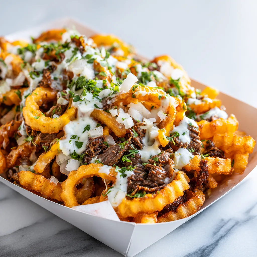 Crispy curly fries piled high with smoky citrus-marinated carne asada, creamy nacho cheese sauce, diced white onion, and fresh cilantro — a street-food classic made at home.