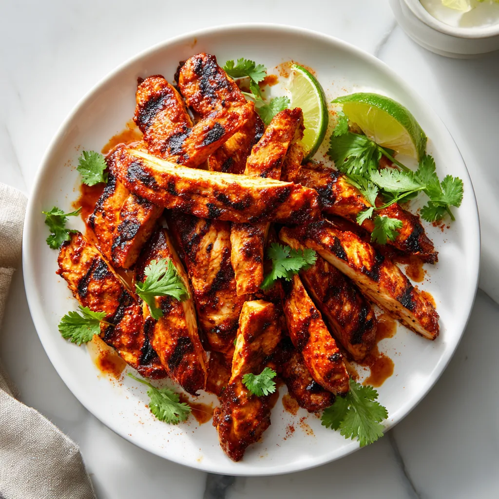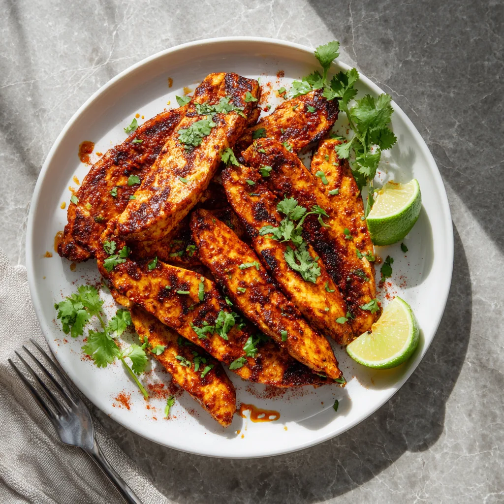 This is not your average plain grilled chicken. The marinade combines smoked paprika, cumin, garlic, chili powder, lime juice, and a touch of honey to create a coating that caramelizes beautifully under heat — producing those gorgeous charred spots you can see in every photo. The lime juice tenderizes the meat while the spice blend builds complexity in every layer. Finished with a shower of fresh cilantro and a squeeze of lime, these tenders are bright, earthy, smoky, and just a little bit addictive.