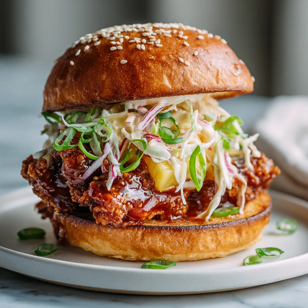 There are chicken sandwiches, and then there are experiences. This recipe falls firmly in the second category. The combination of tropical teriyaki glaze with the heat of sriracha mayo creates a dynamic flavor contrast that keeps every bite interesting. The pineapple slaw adds freshness and crunch, cutting through the richness of the fried chicken without overwhelming the other flavors. And that brioche bun? It’s the soft, golden throne that holds everything together beautifully.