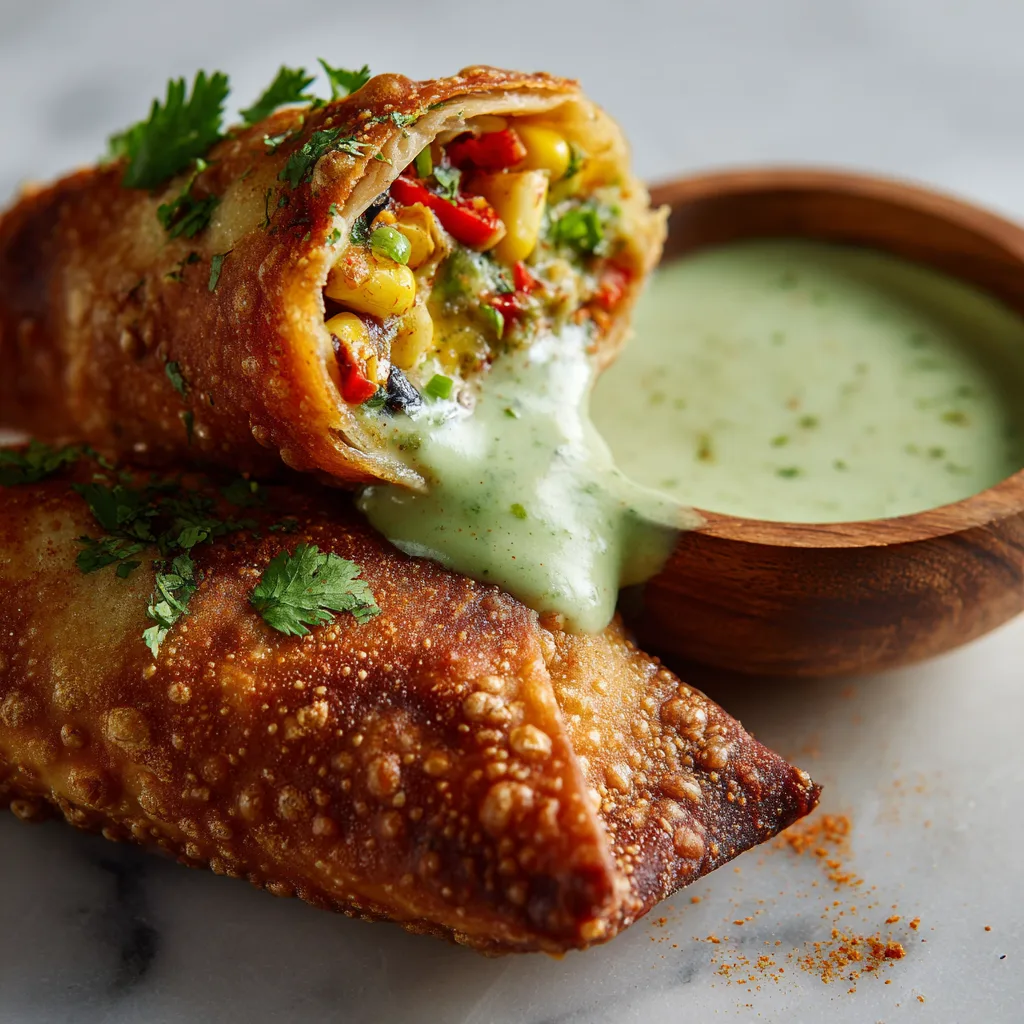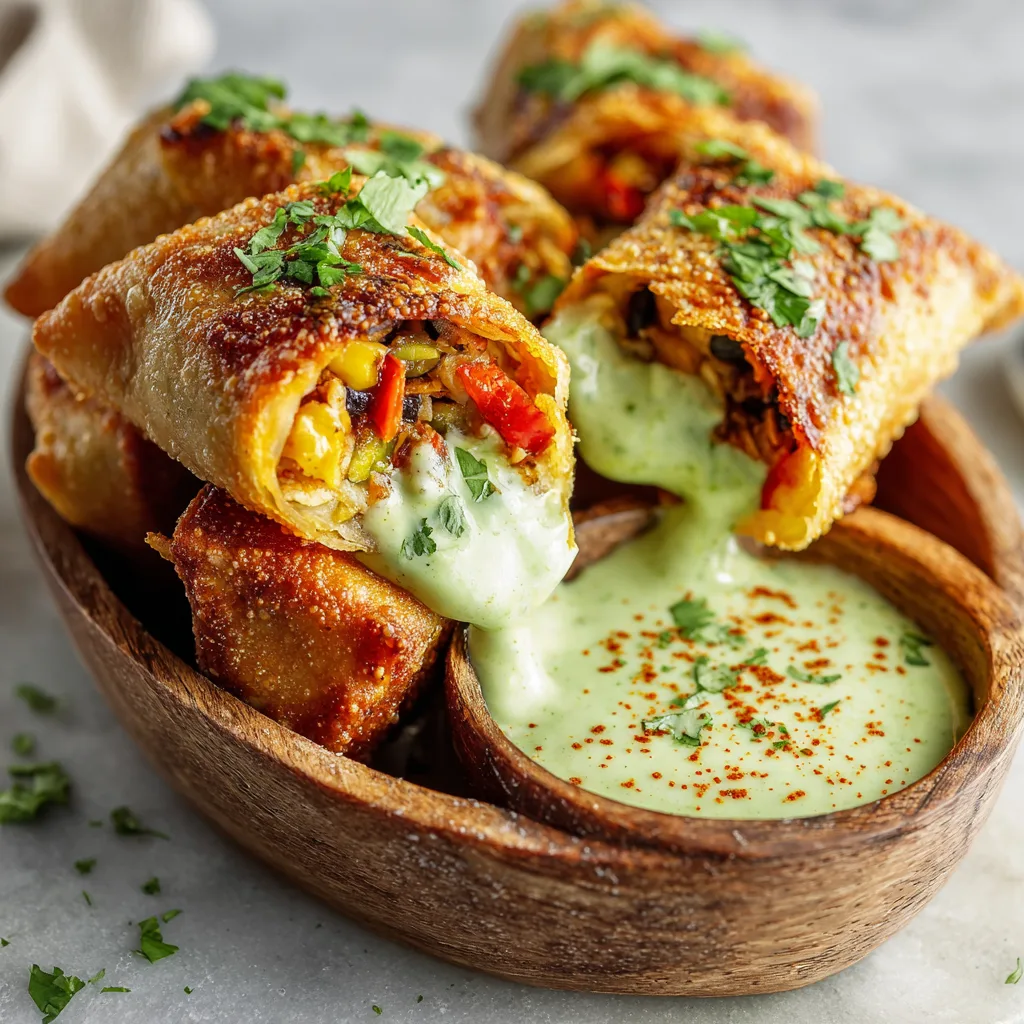 Crispy egg rolls stuffed with seasoned shredded chicken, black beans, corn, bell peppers, and melted cheese, served with a creamy avocado dipping sauce.