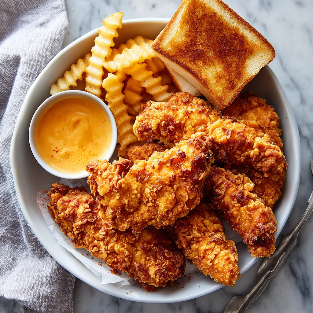 Restaurant-style crispy chicken tenders marinated in buttermilk, served with crinkle fries, Texas toast, and a signature tangy dipping sauce.
