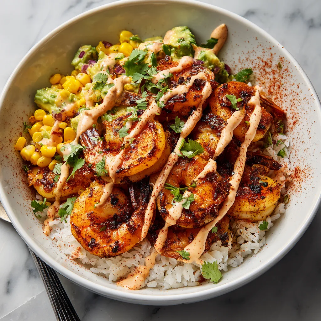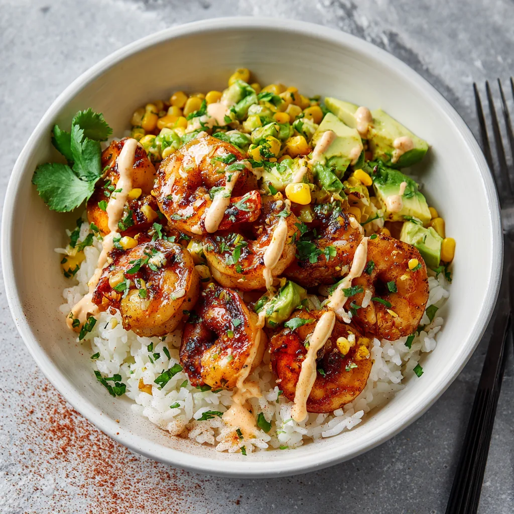 When preparing your avocado and corn topping, try to dice the avocado just before assembling the bowls to prevent browning. The acid from the lime juice will help preserve the vibrant green color, but freshness is key. If you want to elevate the corn, consider tossing it in a dry skillet over high heat for a few minutes before mixing it with the avocado. This will give the corn a slight char, echoing the smoky notes of the paprika in the shrimp.
