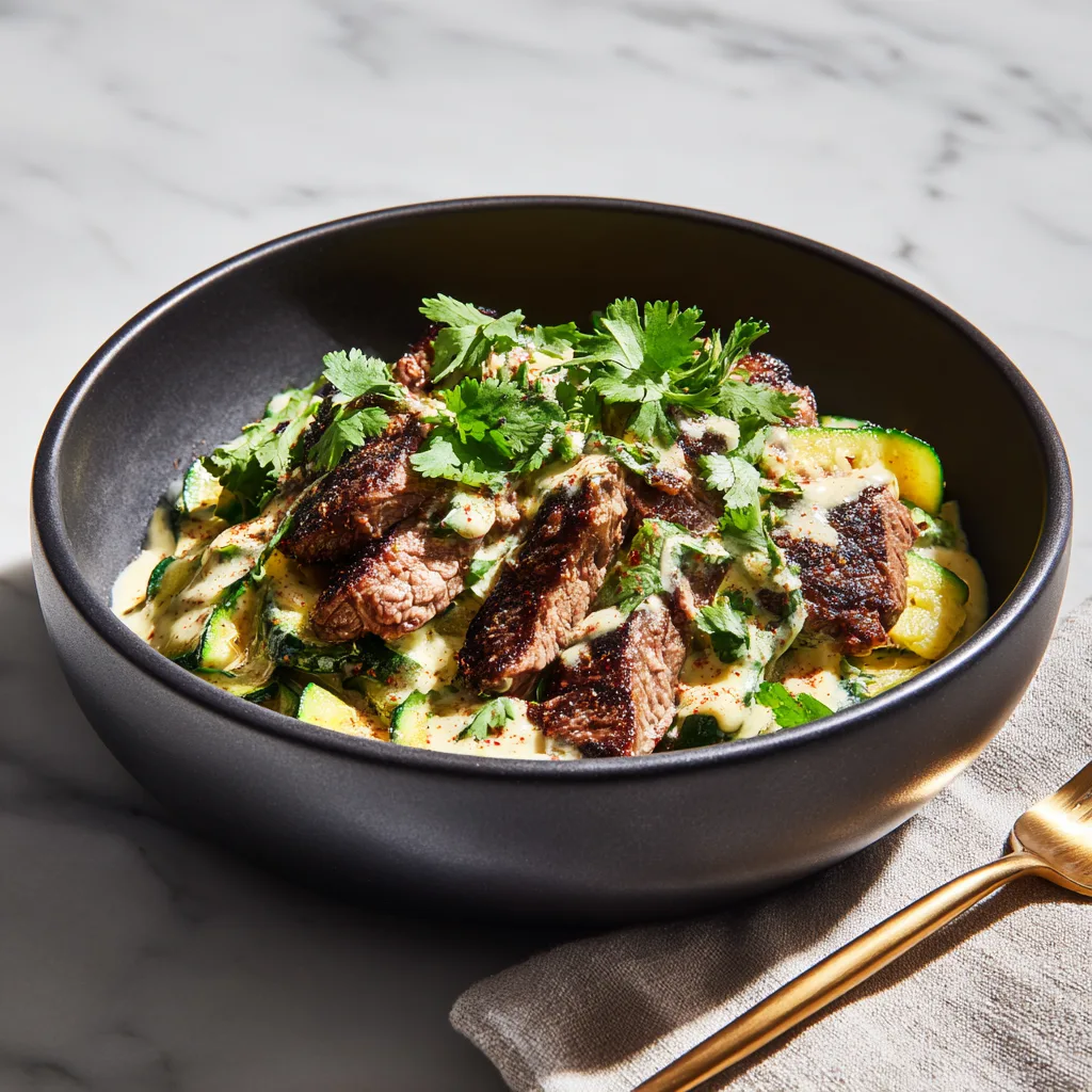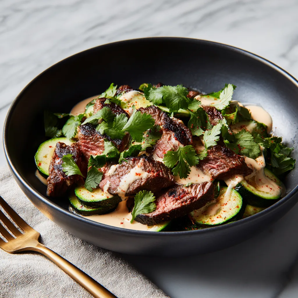A high-protein, low-carb steak bowl featuring juicy grilled ribeye, tender zucchini, and a cooling garlic Greek yogurt sauce. Perfect for meal prep or a healthy dinner.